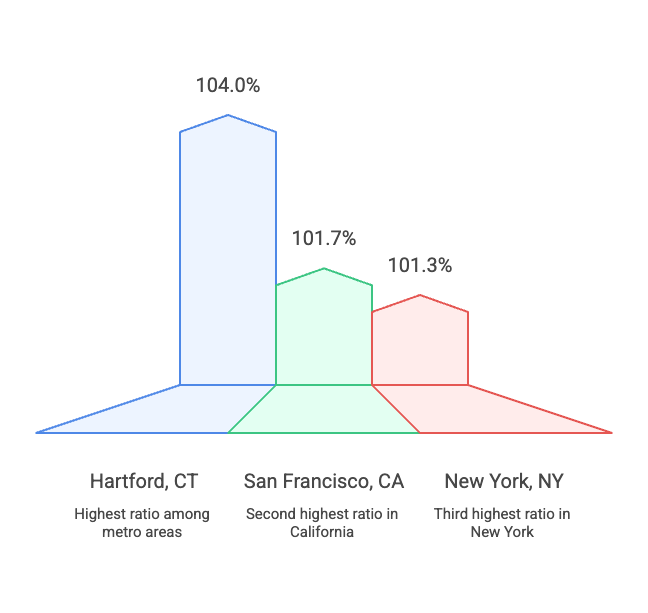 In August 2025, the average close-to-list price ratio of all 51 metro areas in the report was 99%, the same as August 2024 and July 2025. The close-to-list price ratio is calculated by the average value of the sales price divided by the list price for each transaction. When the number is above 100%, the home closed for more than the list price. If it’s less than 100%, the home sold for less than the list price. The metro areas with the highest close-to-list price ratios were Hartford, CT at 104.0%, San Francisco, CA at 101.7%, and New York, NY at 101.3%. The metro areas with the lowest close-to-list price ratio were Miami, FL at 93.7%, San Antonio, TX at 95.7%, followed by a tie between Bozeman, MT and Tampa, FL at 96.4%.