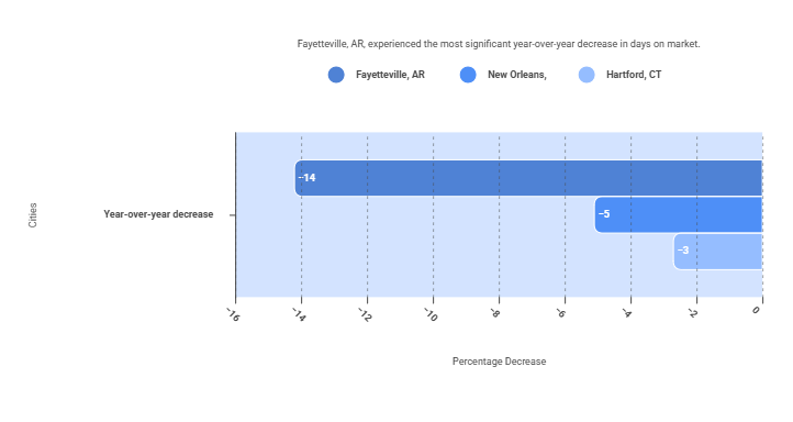 The average days on market for homes sold in November 2025 was 54, up seven days compared to the average in November 2024 (47) and up four days compared to October 2025 (50). The metro areas with the biggest year-over-year increase for days on market averages were St. Louis, MO at +39.1% (44 days), Manchester, NH at +38.7% (27 days) and Washington, DC at +28.7% (39 days). The markets with the biggest year-over-year decrease for days on market averages were Fayetteville, AR at -14.2% (65 days), New Orleans, LA at -5.1% (64 days) and Hartford, CT at -2.7% (24 days). Days on market is the number of days between when a home is first listed in an MLS and a sales contract is signed.