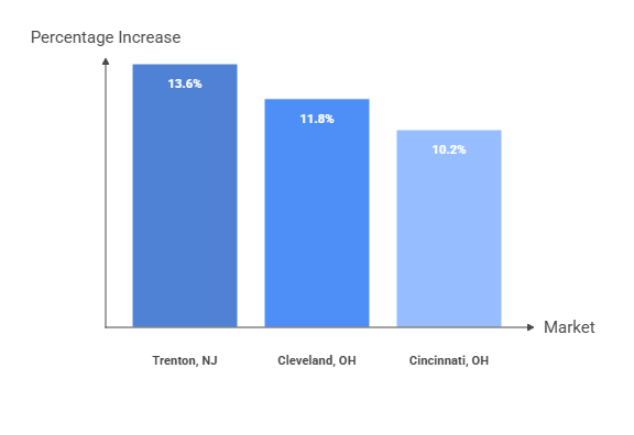 In November 2025, the median of all 51 metro area sales prices was $438,000 up 1.7% from November 2024, and down 1.5% compared to October 2025. The markets with the biggest year-over-year increase in median sales price were Trenton, NJ at +13.6%, Cleveland, OH at +11.8%, and Cincinnati, OH at +10.2%. The markets with the biggest year-over-year decrease in median sales price were Seattle, WA at -4.7%, Tampa, FL at -3.5%, and Richmond, VA at -2.5%.