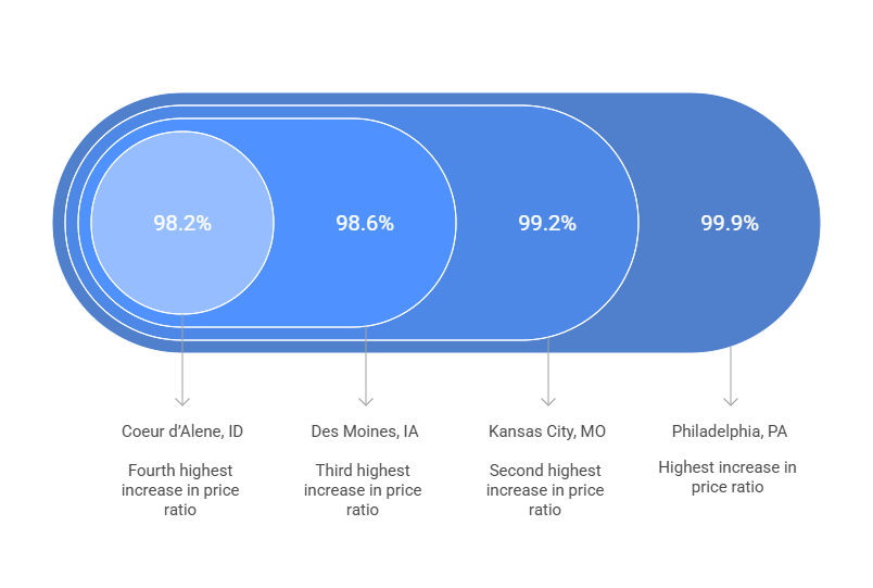 In November 2025, the average close-to-list price ratio of all 51 metro areas in the report was 98%, down from 99% in November 2024 and the same as October 2025. The close-to-list price ratio is calculated by the average value of the sales price divided by the list price for each transaction. When the number is above 100%, the home closed for more than the list price. If it’s less than 100%, the home sold for less than the list price. The metro areas with the biggest year-over-year decrease in close-to-list price ratios were Burlington, VT at -2.1 pp (98.3%), Dover, DE at -1.5 pp (98.6%), and Baltimore, MD at -1.2 pp (99.5%). The metro areas with the biggest year-over-year increase in close-to-list price ratio were Philadelphia, PA at +0.3 pp (99.9%), followed by Des Moines, IA (98.6%), Kansas City, MO (99.2%) and Coeur d’Alene, ID (98.2%) tied at +0.2 pp.